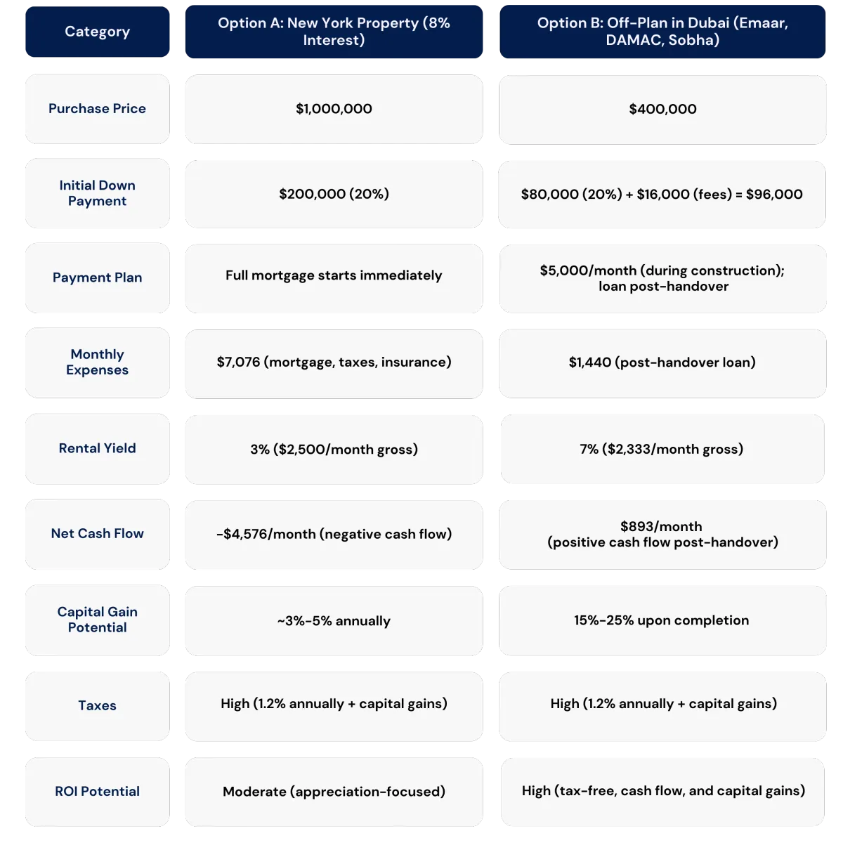 Higher ROI: Dubai offers ~7% rental yields and 15%-25% capital appreciation upon completion, outperforming New York’s rental and appreciation potential.